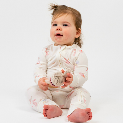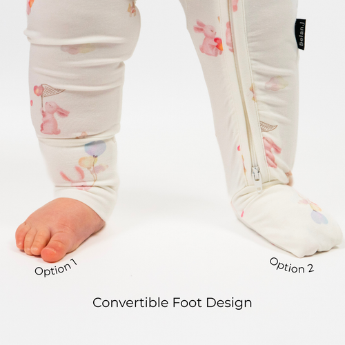 Introducing the Love Bunnies Sleeper—premium bamboo rayon designed for gentle, restful nights. Crafted from thicker, buttery-soft fabric, this footless sleeper keeps your little one comfortable with natural breathability and moisture-wicking properties that regulate temperature throughout the night. The 2-way YKK zipper enables quick diaper changes, while protective fold-over cuffs and chin guard prevent scratches. Convertible foot cuffs let you adjust warmth as needed. Perfect for babies who deserve the softest, safest sleep experience.