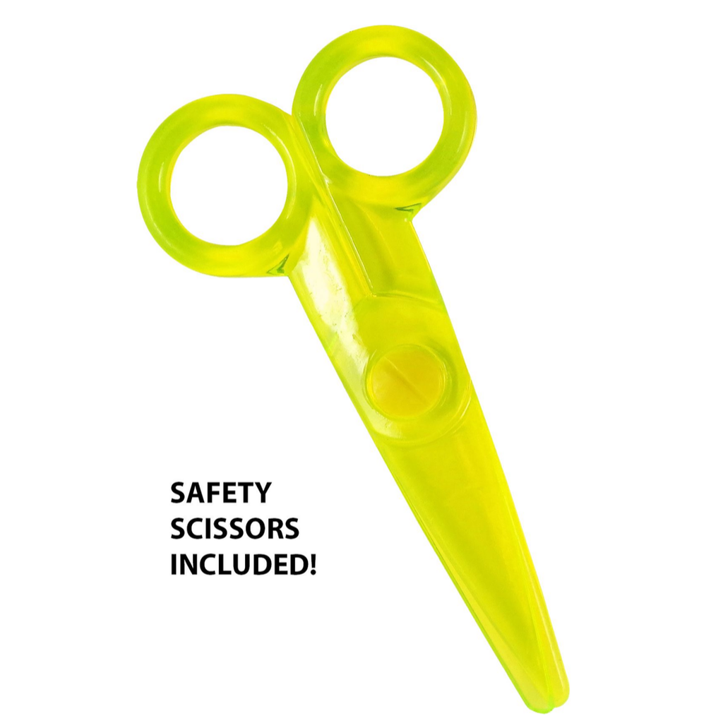 - A pair of translucent child's safety scissors comes with the book.