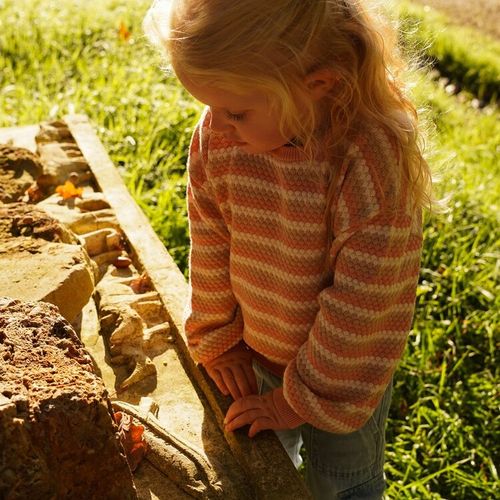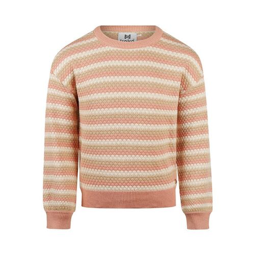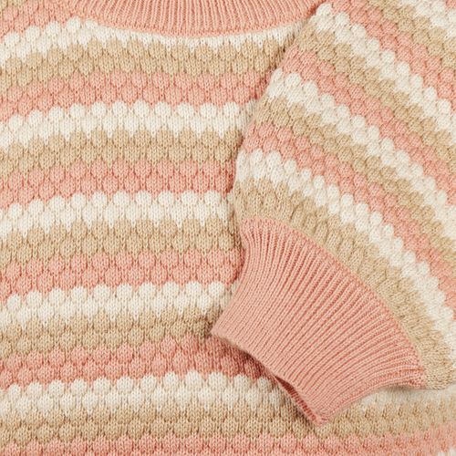 Introducing the perfect striped sweater for your little fashionista! This charming Koko Noko design blends soft pink, off-white, and sand tones into a playful pattern that pairs with everything in her wardrobe. The relaxed silhouette features dropped shoulders and a gently loose fit that's both comfy and chic. Crafted from fine knit with delightful textured details, this jumper brings personality and coziness to everyday wear. Whether she's playing at the park or heading to school, this versatile sweater keeps her looking effortlessly cool.