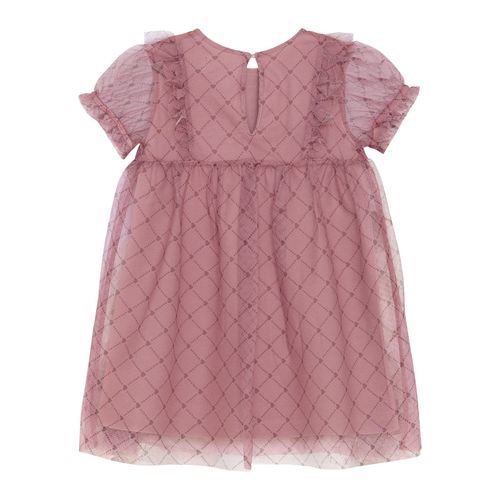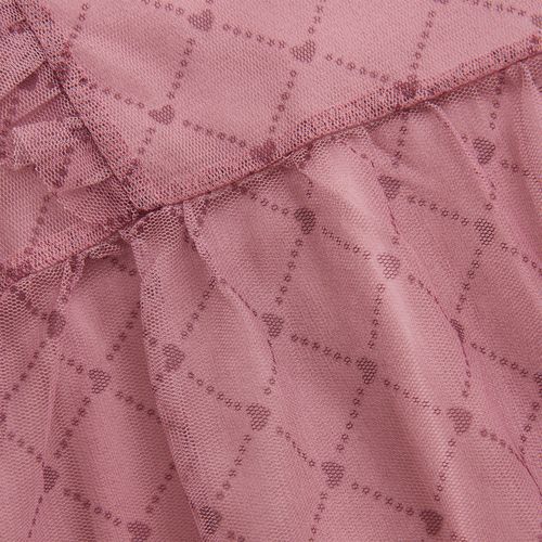 This charming mesh dress from Creamie features playful heart prints on its delicate top layer. Beneath, a cozy, opaque lining ensures full coverage. With frilly shoulders, puffed sleeves, and a gathered skirt that flares out beautifully from a chest seam, this dress is both sweet and fun. It fastens at the back with a button above a stylish teardrop cutout, adding a delightful finishing touch.