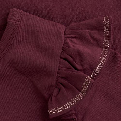 This Creamie long-sleeve girl’s T-shirt features playful ruffle details on the shoulders. Made from a soft cotton and elastane blend, it offers comfort with a touch of stretch. The charming Vineyard Wine color and Danish design add a fun, stylish twist.