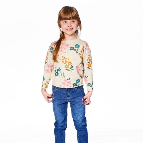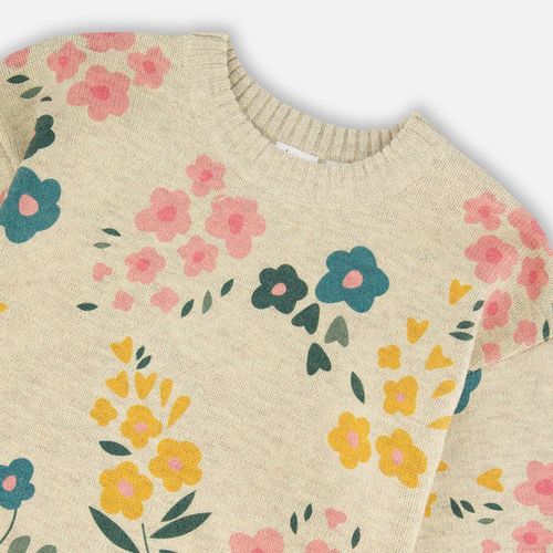 This Knit Sweater in Oatmeal has a gorgeous floral pattern and brings a soft, cozy feel with a touch of vintage charm. This knit pullover features long sleeves, dropped shoulders, round neckline, ribbed cuffs and hem, and a delicate allover floral print in pink, orange, and blue tones. Easy to match with any bottom, it’s a comfy staple that pairs beautifully with other pieces.