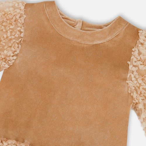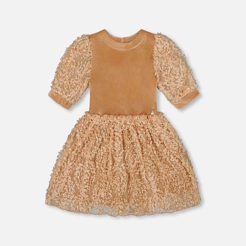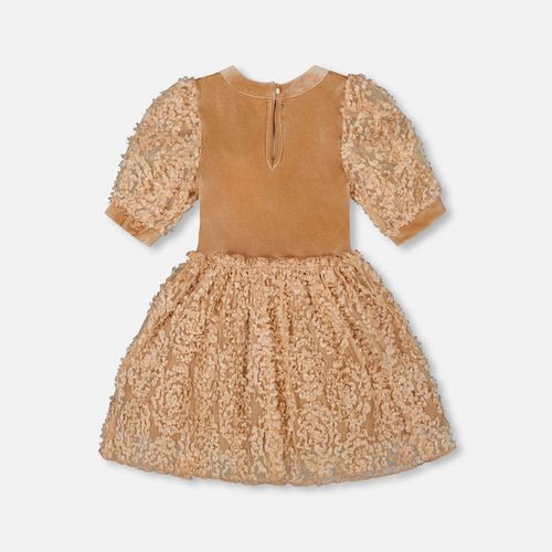 This delightful short-sleeve dress in warm Nougat is perfect for adding a touch of magic to her special day. The cozy velour bodice with a classic round neckline pairs beautifully with puffed lace sleeves that bring a whimsical charm. Its flared A-line skirt, crafted from textured lace, moves gracefully with every twirl, making her feel like the star of the party. Combining soft, luxe fabrics and rich textures, this dress is an irresistible choice that brings both comfort and style for any formal celebration or joyful gathering.