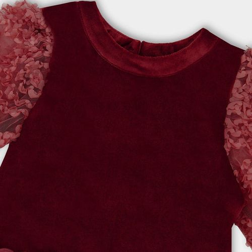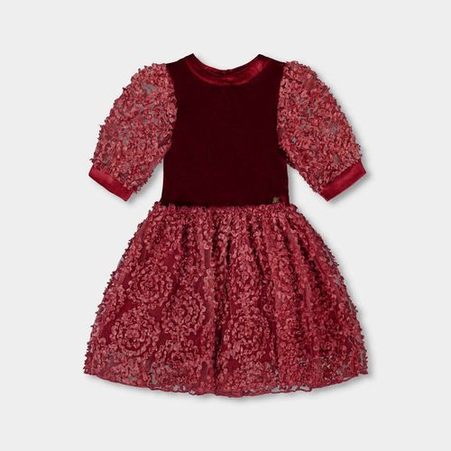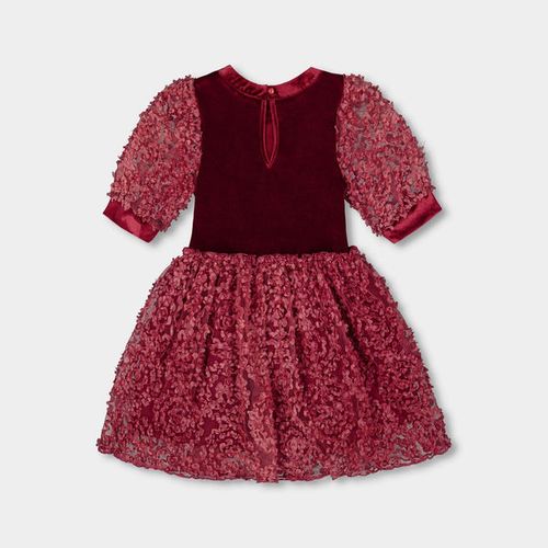 This delightful short-sleeve dress in warm Tibetan Red is perfect for adding a touch of magic to her special day. The cozy velour bodice with a classic round neckline pairs beautifully with puffed lace sleeves that bring a whimsical charm. Its flared A-line skirt, crafted from textured lace, moves gracefully with every twirl, making her feel like the star of the party. Combining soft, luxe fabrics and rich textures, this dress is an irresistible choice that brings both comfort and style for any formal celebration or joyful gathering.