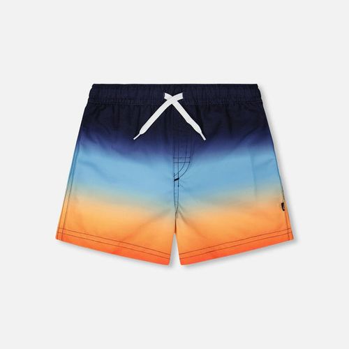 Dive into summer with these eye-catching swim trunks that transition from ocean blue to sunset orange in a stunning gradient. Cut above the knee for easy movement, they're made from lightweight recycled polyester with a soft mesh lining that keeps you comfortable and dry. The elastic waist and drawstring ensure a secure fit whether you're catching waves or lounging poolside. Perfect for kids who want to make a splash in style.