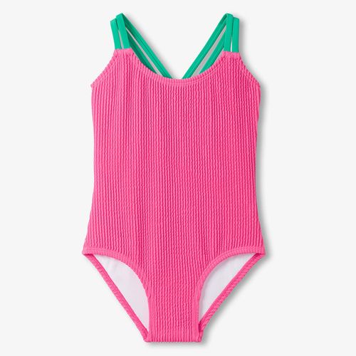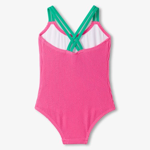 Make a splash in this vibrant azalea pink one-piece that's as fun as it is functional. The soft, stretchy fabric moves with your child through every cannonball and dive, while the double cross straps keep everything secure and add a playful pop of green. Fully lined for comfort and confidence, this ribbed swimsuit is built to handle serious pool time without missing a beat.