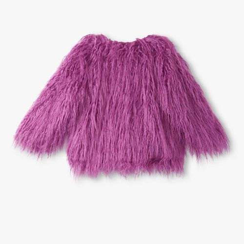 Infuse her chilly days with fun and flair wearing the Girls Radiant Orchid Mongolian Faux Fur Topper. This eye-catching piece blends cozy warmth with a pop of vibrant magenta-purple, thanks to its fluffy long-pile faux fur. Crafted for comfort, it features an open front with three subtle hook-and-eye fasteners, long sleeves, and a silky satin lining for a sleek feel. Plus, a handy hanger loop at the back keeps it ready for the next adventure.