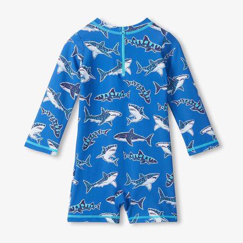 Dive into summer style with this shark-themed one-piece rashguard that's as fun as it is functional. Featuring vibrant shark graphics with eye-catching patterns, it delivers UV protection to keep delicate skin safe from the sun. The lightweight, stretchy fabric moves with your little one through water play and sandy adventures, while quick-dry technology and chlorine-resistant materials ensure durability through countless splashes. Convenient snap and zipper closures make dressing effortless for busy parents. Crafted in ocean blue with crisp light blue accents, this playful suit is ready for every beach day and pool party.