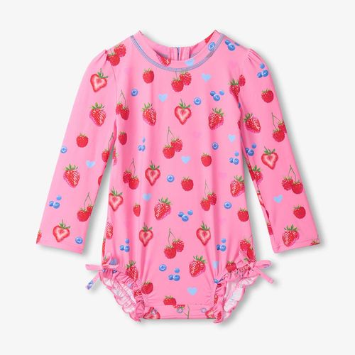 Let your little one make a splash in this delightful rashguard adorned with juicy strawberries, raspberries, blueberries, and sweet hearts. Built-in sun protection keeps delicate skin safe while the stretchy nylon-spandex blend moves with every wiggle and kick. Quick-drying and tough against chlorine and saltwater, this suit handles all your summer adventures without missing a beat. The convenient back zipper and snap inseam transform diaper changes from stressful to speedy. A playful pick that keeps babies happy and parents stress-free all season long.