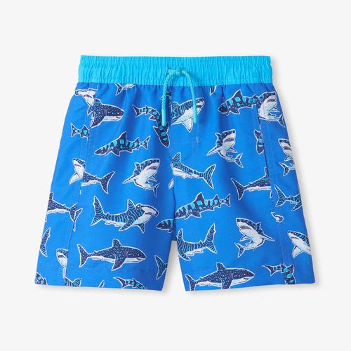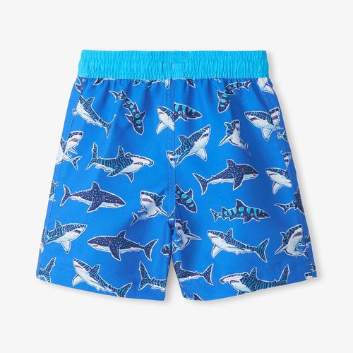 Dive into adventure with these shark-themed swim trunks designed for young water lovers. Featuring an eye-catching all-over shark pattern in white, blue, and dark blue against a vibrant blue base, they're as fun as they are functional. The quick-drying polyester keeps kids comfortable whether they're splashing in the pool or exploring the ocean, while the mesh lining provides extra support. Built tough to resist chlorine and saltwater damage, these trunks won't quit on you. A light blue elastic waistband with drawstring ensures a secure fit, and handy side pockets are perfect for stashing shells, rocks, and other beach finds. Let the underwater fun begin!