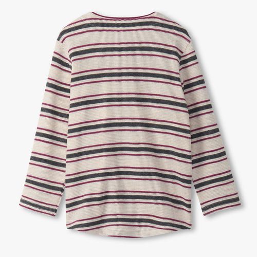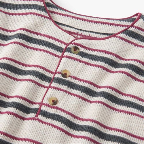 Bundle him up in cozy charm with the Boys Oatmeal Striped Waffle Henley, made from 100% cotton featuring a thick waffle-knit that delivers warmth and a playful texture. This relaxed favorite flaunts vibrant burgundy, navy, and cream stripes on a soft oatmeal melange base, creating a classic yet easygoing style. It’s finished with ribbed collar accents and a three-button henley placket, perfect for lively days and layering on crisp afternoons.