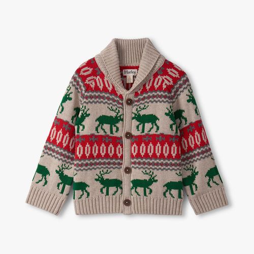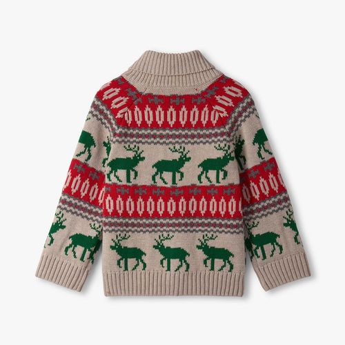 Wrap your little one in holiday cheer with this charming Winter Elk Cardigan! Crafted from a soft cotton-acrylic blend, this cozy layer features a festive Fair Isle design with reindeer, geometric patterns, and colorful accents in green, red, and gray against an oatmeal base. The shawl collar and wooden-style buttons deliver classic style, while ribbed cuffs and hem keep everything snug and secure. Perfect for creating those picture-perfect winter moments, whether you're heading to holiday gatherings or just staying warm on frosty days.
