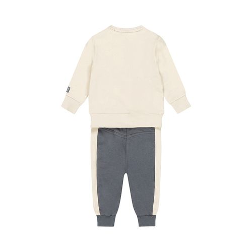 Keep your little one snug and stylish in this charming two-piece set from Dirkje. The cream sweater features adorable animal friends—a bear and hippo—set against navy and rust-brown color blocks for visual interest. Convenient shoulder snaps make diaper changes and dressing effortless. Pair it with the coordinating navy jogging pants, complete with fun tan piping and a stretchy waistband for all-day comfort. Crafted from 100% soft cotton, this cozy ensemble is perfect for playtime or relaxed days at home.