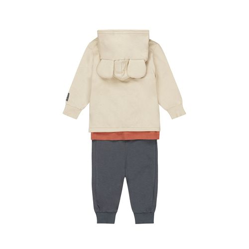 This charming 3-piece jogging set keeps your little explorer cozy and stylish. The navy hooded cardigan features adorable animal friends and contrasting cream accents, layering perfectly over the coordinating rust-toned long-sleeve tee with shoulder snaps for easy dressing. Soft, stretchy cotton pants with an elastic waistband and cuffs round out the playful ensemble. Designed for active toddlers who love to move, this mix-and-match set offers comfort and character in every wear.