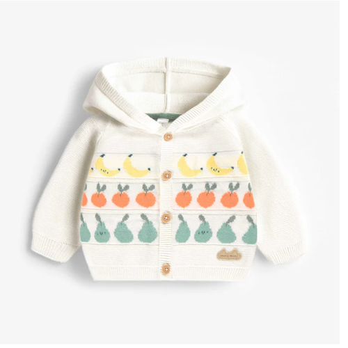 This delightful cream cardigan brings fruity fun to little ones' closets. Soft cotton knit showcases cheerful jacquard fruit designs, while a cozy hood with drawstring adds extra charm and warmth. Button-front closures make getting dressed a breeze, and ribbed knit at the cuffs and hem ensures a snug, comfortable fit. The relaxed silhouette is perfect for playtime and everyday adventures.