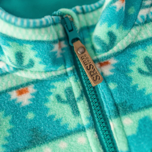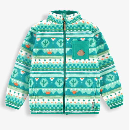 Stay cozy in style with this vibrant turquoise fleece jacket, designed to keep little ones warm on crisp days. The playful pattern adds personality, while practical features like the protective chin guard zipper, roomy pockets, and high collar deliver comfort and function. Layer it under a heavier coat for extra insulation, or wear it solo for everyday adventures.
