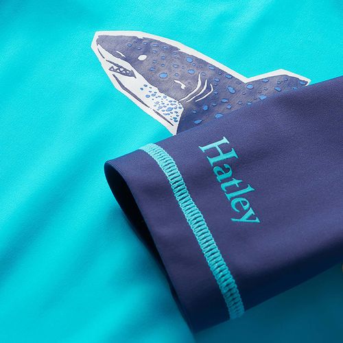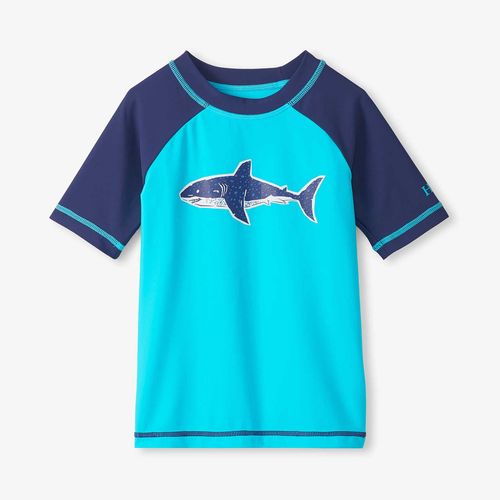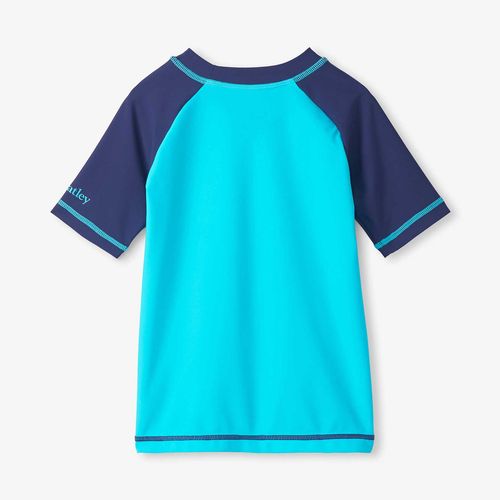 Dive into summer style with this eye-catching Short Sleeve Rashguard featuring a striking blue shark design across the chest. The color-blocked torso blends light blue with dark blue shoulders and sleeves, accented by contrasting stitching details and a signature Hatley logo on the arm. Built from soft, stretchy knit fabric, it moves with your child through water play and beach adventures. Quick-drying and resistant to chlorine and saltwater, this rashguard bounces back from every splash and splash-back. The pull-on design makes changing between activities effortless, so kids spend less time fussing and more time having fun in the sun.