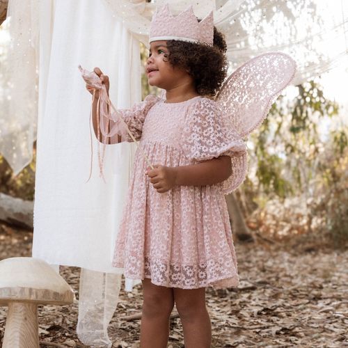 No dress-up look is truly magical without the perfect crown and wand set. This delightful duo features a crown designed with soft ties to ensure an adjustable and cozy fit for little royalty of all ages. The star wand, made from a smooth wooden dowel, sparkles with charm thanks to its tinkling bell and flowing tulle ribbon that twirls with every wave. Both pieces showcase our charming embroidered daisy mesh in a lovely rose hue, adding a touch of whimsy and elegance to any dress-up adventure. Ideal for birthdays, playdates, or simply bringing fairy tales to life!