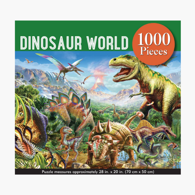 Dive into a prehistoric adventure with this thrilling 1000-piece puzzle! Watch as fearsome dinosaurs—both colossal and tiny—come to life across an ancient landscape rendered in stunning, vibrant detail. Each of the 1000 precision-cut pieces locks together perfectly on the durable premium blue board. The linen-textured finish keeps glare at bay, while the included full-color poster guides you to victory. Perfect for puzzle enthusiasts seeking an epic challenge, this 28" x 20" masterpiece promises hours of roaring good fun. Includes sturdy storage box. Warning: Choking hazard. Not suitable for children under 3.