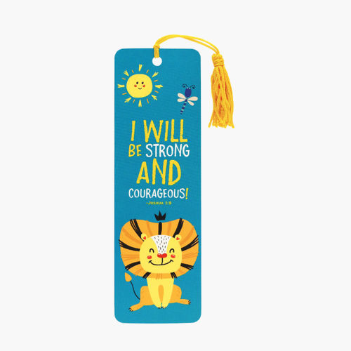 Inspire young readers with this vibrant bookmark featuring a bold lion crowned beneath the sun and a graceful dragonfly. Printed on premium card stock with eye-catching gloss accents, it showcases the empowering Scripture verse "I will be strong and courageous!" from Joshua 1:9. A colorful beaded tassel adds charm, while a handy ruler on the back (marked in inches and centimeters) makes it practical for everyday use. Comes protected in a clear plastic sleeve. Measures 2-1/2" wide x 7-1/8" high. Perfect for encouraging confidence in young readers. Warning: Choking hazard—not suitable for children under 3.