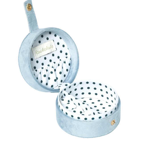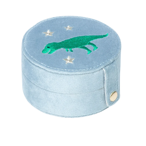 Indulge in a bit of playfulness with this mini velvet jewelry box from Rockahula. Keep your treasures safe in style with an embroidered dinosaur and gold stars on blue velvet. Easily access your items with the pop fastening and find a handy compartment, slip pocket, and special spot for earrings and rings inside.