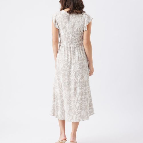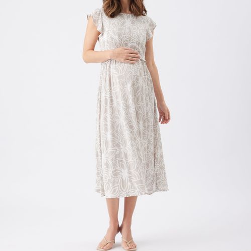 Introducing the Alona Nursing Dress—your new warm-weather essential! Crafted from breathable crinkled viscose, this playful piece features a fitted shirred bodice paired with a floaty gathered skirt that moves with you. Charming shoulder frills and a round neckline add personality, while the clever lift-up nursing layer keeps feeding discreet and easy. Perfect for picnics, garden parties, or casual coffee runs, this dress transitions effortlessly from season to season. Slip on your favorite sandals and you're ready for anything. Available in Sand/White. 100% Viscose.