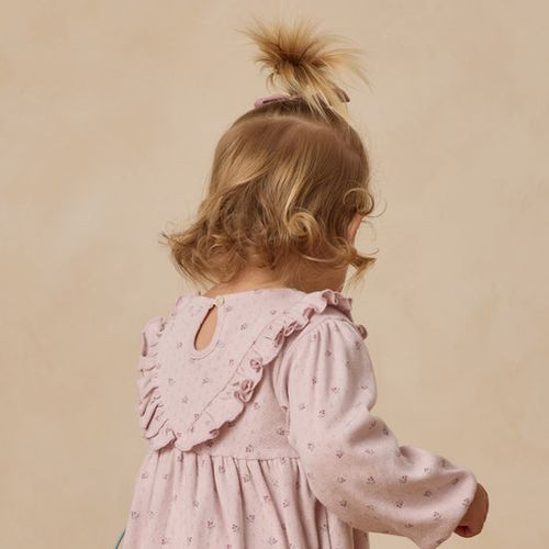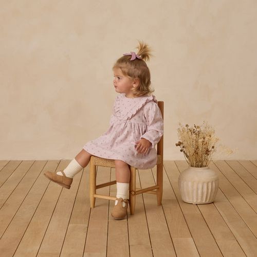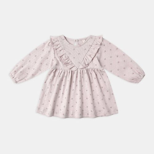 This charming long sleeve dress, crafted from our soft and breathable pointelle fabric, is perfect for playful days and special outings alike. It features a delicate V-ruffle detail that adds a touch of whimsical elegance, along with a convenient button-back closure to make dressing quick and easy. The matching bloomers complete the look with an adorable flair, ensuring comfort and style from head to toe. Showcasing the delightful ‘lilac ditsy’ print on a gentle lilac background, this dress is sure to brighten any little one’s wardrobe with its sweet and spirited design.