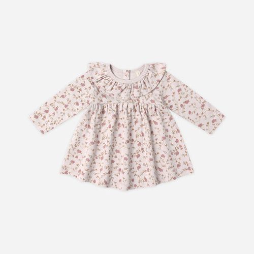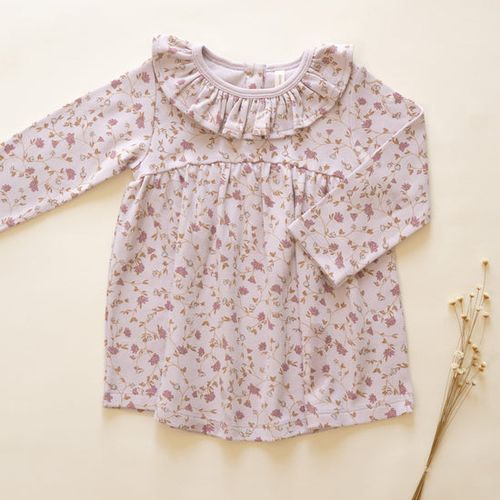 This darling dress is crafted from soft brushed jersey and features a charming ruffled collar that adds a touch of whimsy to any outfit. The coordinating bloomers provide comfort and coverage, while the back button placket makes getting dressed a breeze. The delightful garden print dances across a lovely lilac hue, creating a cheerful look that's ready for playdates, family gatherings, or everyday adventures. Whether she's exploring the backyard or heading to daycare, this sweet piece combines style with practicality, making it an instant favorite in any child's wardrobe.