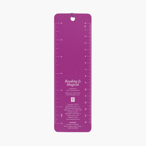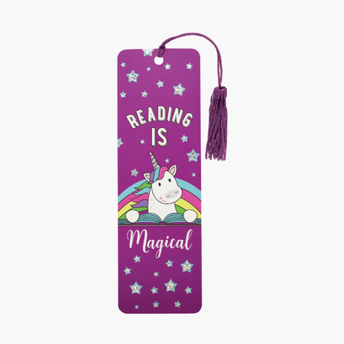 Spark a love of reading with this whimsical bookmark featuring a dreamy unicorn surrounded by rainbows, stars, and shimmering silver foil details. The playful "Reading Is Magical" message inspires young bookworms to dive into their next adventure. A soft purple tassel adds charm, while the sturdy card stock keeps it durable through countless page turns. Flip it over to discover a handy ruler in inches and centimeters—perfect for creative projects. Comes protected in a clear plastic sleeve. Measures 2-1/2" wide x 7-1/8" high. Warning: Choking hazard for children under 3.