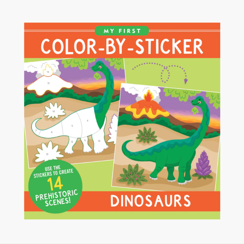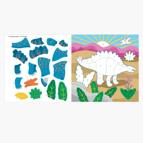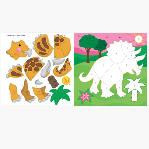 Dinosaur lovers, get ready for a roaring good time! This interactive sticker book features 14 prehistoric scenes just waiting to come alive. Kids simply match numbered stickers to numbered spots—no coloring skills needed! Oversized stickers are designed for little hands to grip and place with ease. Each vibrant, full-color sticker transforms the scenes into a dino-filled adventure. The perforated pages let children proudly display their finished masterpieces. Bonus: it's a sneaky way to build number recognition while having a blast. Printed on sturdy card stock with single-sided pages. Perfect for ages 4 and up.