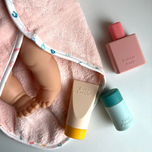 This adorable accessory set includes everything your child needs to care for their doll at bath time. From gentle washing and lotioning to cuddling in the towel, get ready for the sweetest bathtime adventures!