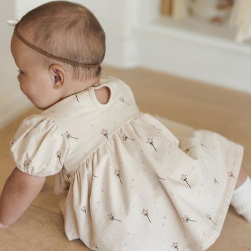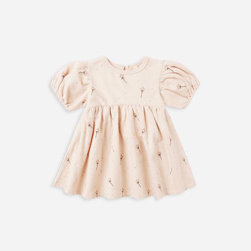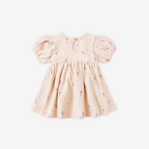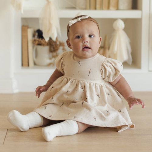 Our fleece Darla Dress features a babydoll silhouette with an empire waist, balloon sleeves, and a coconut button keyhole at the back. Coordinating bloomers included with all sizes.