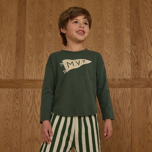 Enjoy everyday comfort with the Long Sleeve Tee - MVP, designed for a relaxed fit that moves with your little one. Featuring a soft crewneck and a gently curved hemline, this tee adds a playful touch to any outfit. Sizes 0-3M through 18-24M include handy shoulder snaps, making outfit changes quick and fuss-free—perfect for busy parents and happy babies. Whether playing, napping, or exploring, this long sleeve tee keeps your MVP cozy and stylish all day long.