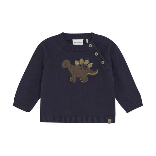 Minymo baby boys dino sweater in a cozy navy blue knit that's perfect for little adventurers. This charming pullover features a bold dinosaur design across the front that'll have your little one roaring with delight. The classic round neckline with button details adds a touch of sophistication, while the soft knitted fabric keeps things comfortable for all-day wear. Whether heading to daycare or a family gathering, this playful sweater combines style with practicality—a wardrobe essential that grows with your child's personality.