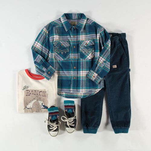 Turquoise checkered shirt in soft flannel. Features two front pockets with embroidery, a classic shirt collar, faux wood buttons, and a relaxed fit.