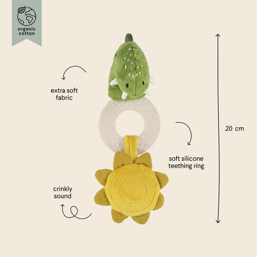 Chunky and chewy, this friendly animal teething toy is perfect for comforting baby's gums and brightening up their day. With its cuddly face, soft silicone teething ring and crinkly attachments, this colorful, grabbable toy will go everywhere they go.