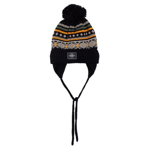 Stay warm and stylish with the Malik Knit Beanie in black. Soft knit with a cozy microfleece lining and ear covers for sizes 2/4 and 5/6. Features a ribbed cuff, playful pompom, and a cool rubber patch—perfect for chilly days full of fun!
