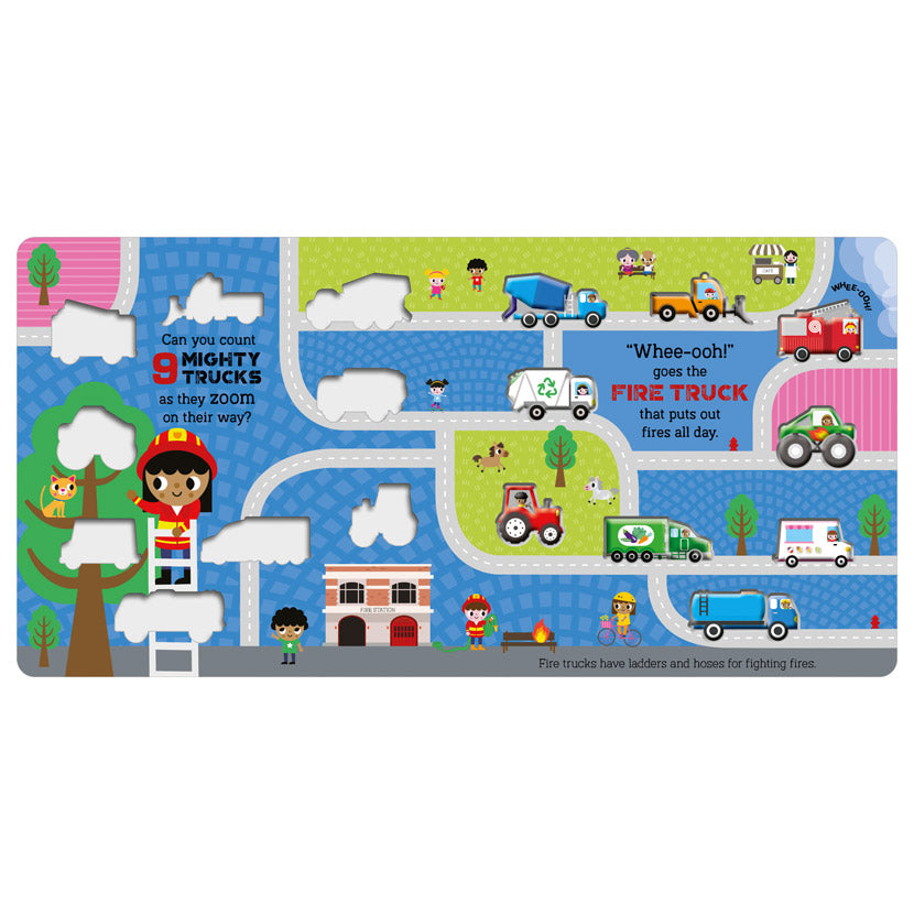 Have fun counting down from 10 with the mighty trucks. This busy board book has 10 vehicle-shaped blisters that disappear one by one with the turn of each page. From dump trucks and tractors to monster trucks and snowplows, there’s something for every vehicle-lover to enjoy!