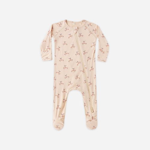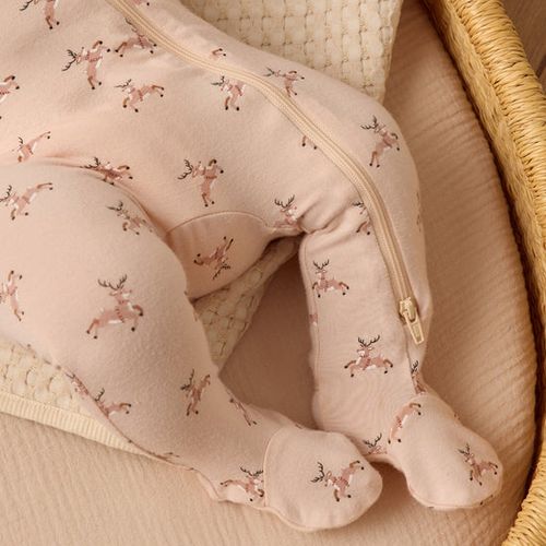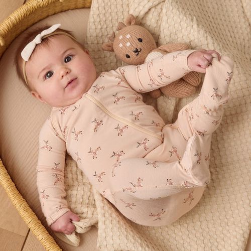 Full double-zip footie crafted from soft, stretchy bamboo fabric that's gentle on delicate skin. Fold-over hand mitts keep tiny hands warm and protected on sizes NB through 3-6M. The raised screen print on soles provides extra grip and traction for crawlers and early walkers in size 6-12M. Dressed in a cheerful reindeer print against an antique backdrop, this cozy footie brings festive charm to bedtime and playtime. The convenient double-zip design makes diaper changes and dressing a breeze, while the breathable bamboo material helps regulate temperature for all-night comfort. Perfect for the holiday season or year-round snuggles.