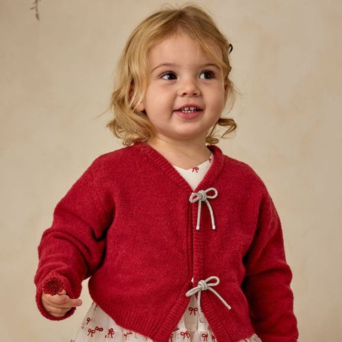 The Bow Cardigan in Ruby adds a playful touch to any outfit with its charming knit texture and delicate bow accents that line the front. Perfect for layering during chilly days, this cozy cardigan brings warmth and style, whether paired with festive holiday dresses or worn solo for a pop of color and personality. Its soft fabric ensures all-day comfort, making it a go-to piece for little ones who love to look cute while feeling snug. Embrace the season’s spirit with this adorable, versatile layer that brightens every occasion.