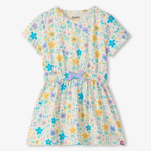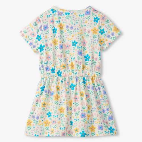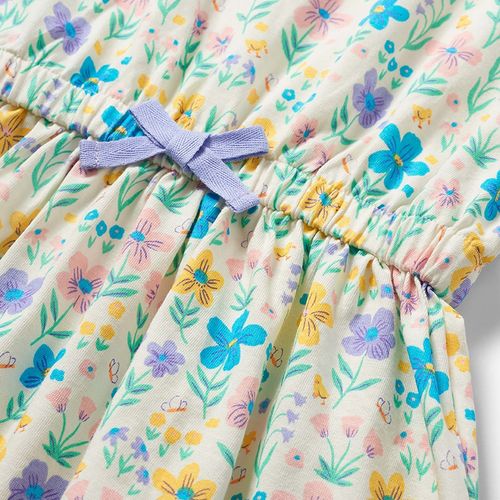 Let your little one bloom in this delightful garden-inspired dress! Soft wildflowers dance across a creamy canvas in dreamy blues, yellows, lavenders, and pinks, while a charming lavender bow ties the whole look together. The elastic waistband keeps her comfy all day long, and snap shoulders make getting dressed a breeze. Perfect for warm weather adventures, playdates, and those Instagram-worthy moments that make childhood magical.