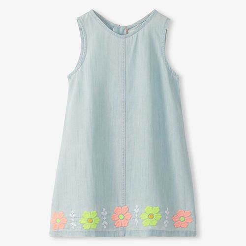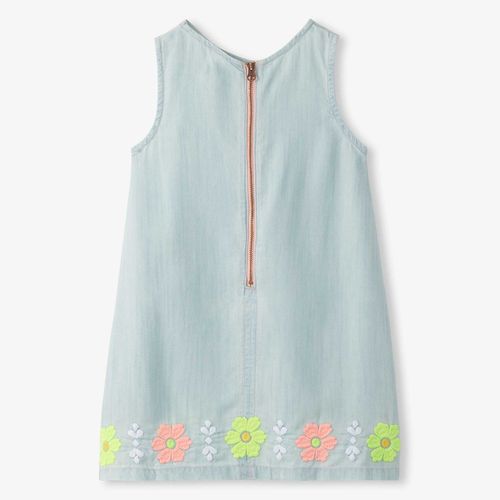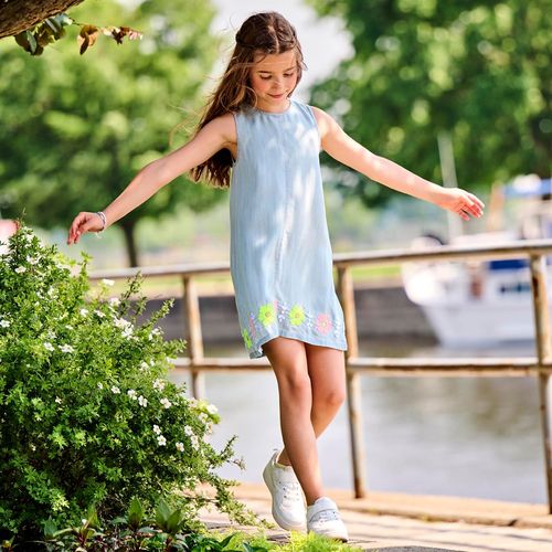 Effortless and charming, this pinafore dress is designed for carefree summer adventures. Crafted from luxuriously soft Tencel fabric with a light-wash chambray look, the sleeveless silhouette flows in a graceful A-line cut that lets her move freely. Hand-embroidered florals in soft pink, lime green, and white dance along the hem for a playful, whimsical finish. The classic round neckline and convenient center back zipper make getting dressed a breeze. Perfect for warm days filled with sunshine and smiles.