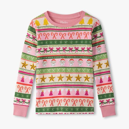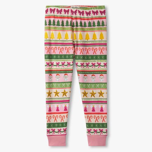 Wake up the holiday spirit with this delightful Fair Isle PJ Set in cheerful pink! Crafted from 100% breathable cotton, this two-piece pajama set keeps your little one cozy through the night. The fitted long-sleeve top and matching full-length bottoms feature a vibrant mix of festive patterns—think jolly Santa faces, candy canes, twinkling stars, Christmas trees, and dancing bells in pink, green, red, yellow, and white. Snug ribbed cuffs at the sleeves and ankles, plus an elastic waistband, ensure a comfortable, secure fit. Perfect for making bedtime merry and bright!