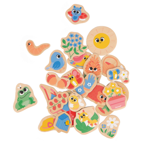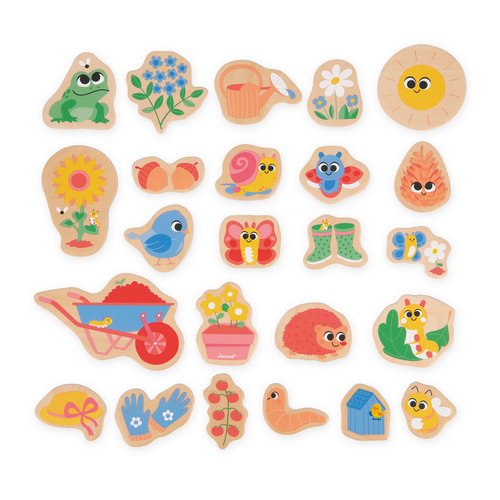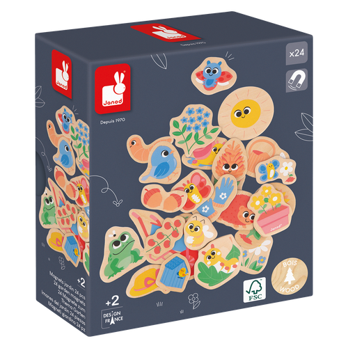 The Garden Magnets 24-piece set by Janod is designed for children aged 2 years and up, promoting imagination and fine motor skills development. This set includes 24 wooden magnets illustrated with garden-themed images, allowing young children to create charming scenes on magnetic surfaces such as refrigerators or magnetic boards.