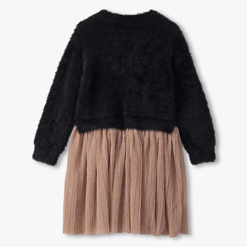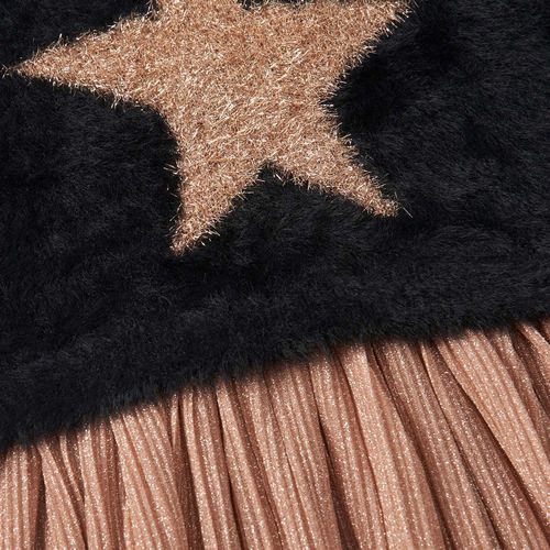 Bring festive sparkle to her wardrobe with the Girls Gold Star Dress, blending the snug feel of a fuzzy black sweater with the shine of a glittery gold skirt—all in one charming outfit. The top boasts a soft, extra-fuzzy 100% nylon knit with ribbed edges and stylish side notches. A dazzling gold star made from tinsel-like threads steals the show, sitting above a flowing pleated skirt crafted from lightweight, shimmering lurex tricot. This dress twinkles and moves with her, making holiday dressing effortless and fun!