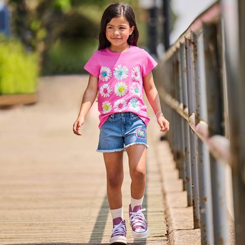 Blooming with personality, this graphic tee brings instant cheer to her everyday rotation. Soft cotton construction keeps her comfortable whether she's at school, the playground, or hanging out with friends. The eye-catching floral design pairs effortlessly with shorts, jeans, or skirts for a look that's uniquely hers. Built to withstand active play and regular washing, the vibrant colors stay bold season after season. Perfect for any girl who loves expressing her style through fun, colorful fashion.