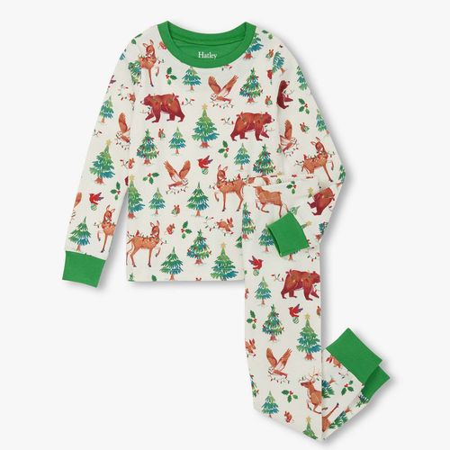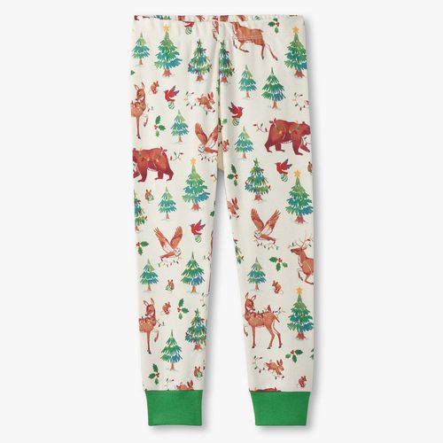 Snuggle up in woodland wonder this holiday season! Our Girls Holiday Animals Cotton Pajama Set features a delightful cream base adorned with cheerful bears, deer, rabbits, cardinals, and festive pine trees in rich greens, browns, reds, and whites. Crafted from 100% breathable cotton, this two-piece set includes a long-sleeve crewneck top and coordinating bottoms, both trimmed with cozy green ribbed cuffs that keep everything perfectly in place. Perfect for holiday movie nights and Christmas morning magic!