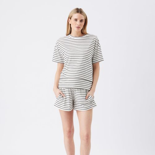 Perfect for casual days and quick errands, these striped shorts bring effortless style to your warm-weather wardrobe. The relaxed fit and elastic waist keep you comfortable all day long, while the yarn-dyed stripe knit jersey adds visual interest without fuss. Pair with our Jada Stripe Nursing Tee for a coordinated, summer-ready look. The relaxed leg silhouette works beautifully with sneakers or sandals. Fabric blend: 56% Polyester, 39% Viscose, 5% Elastane.
