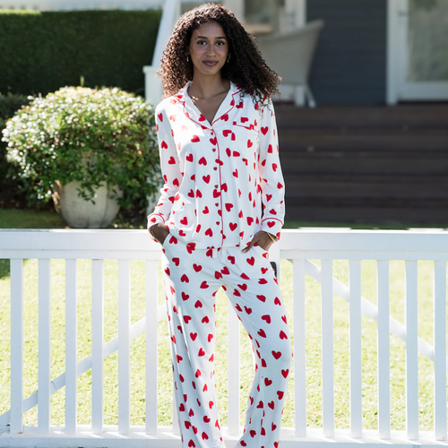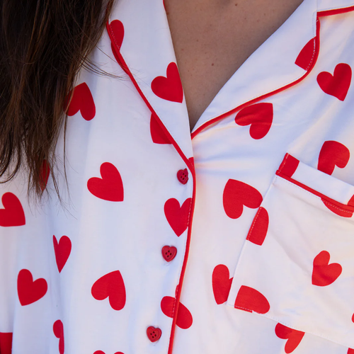 Prepare to fall hopelessly in LOVE with with our new Red Heart print, this simple but classic design will be the perfect addition to your PJ collection. Cozy up in this oversized, long sleeve button up paired with wide leg pants and made in our signature bamboo blend.