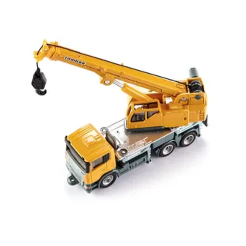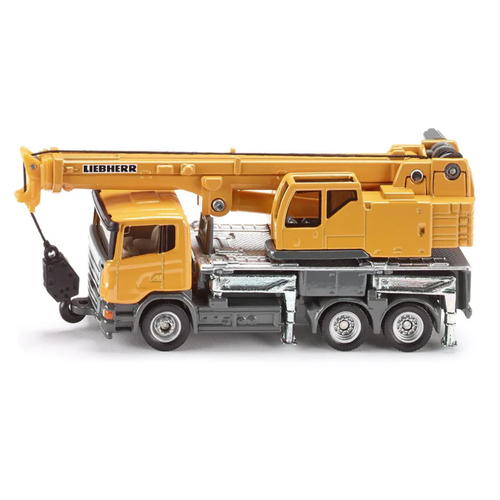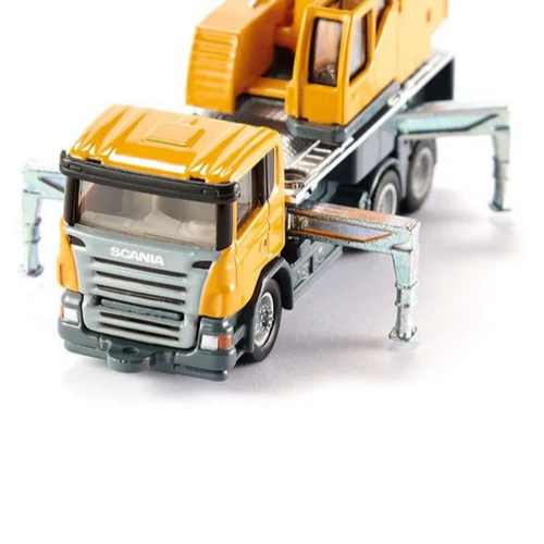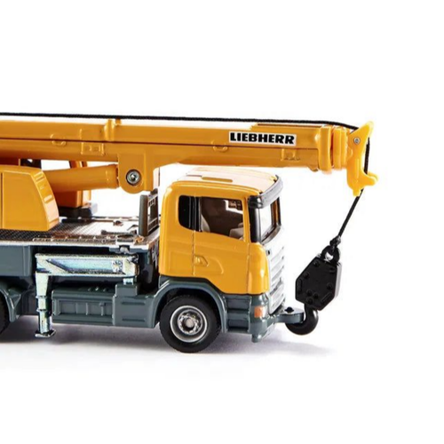 A nimble and flexible crane with 3-axle chassis and Scania driver's cabin. The cabin and rotating crane body are produced in die-cast metal. The adjustable crane arm is single folding, and the 4 supports are extendable. The model has smooth-running wheels with rubber track tires. The crane's metal hook can be raised and lowered using a swivel lever.